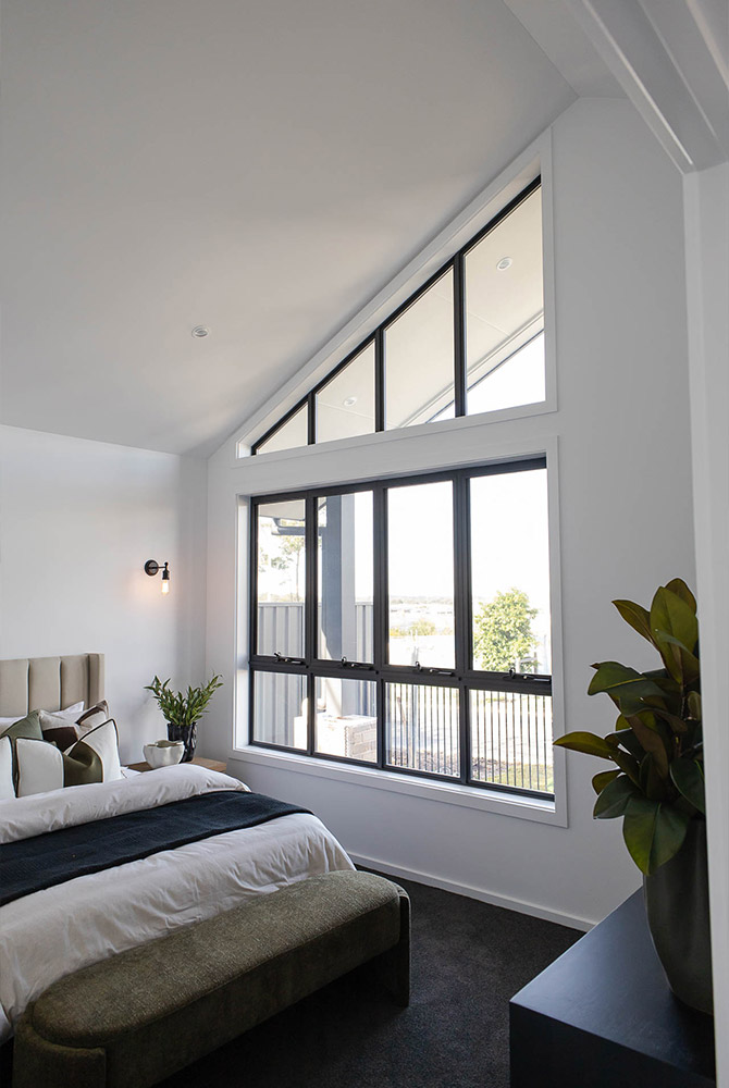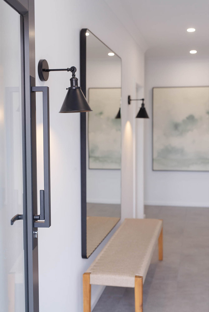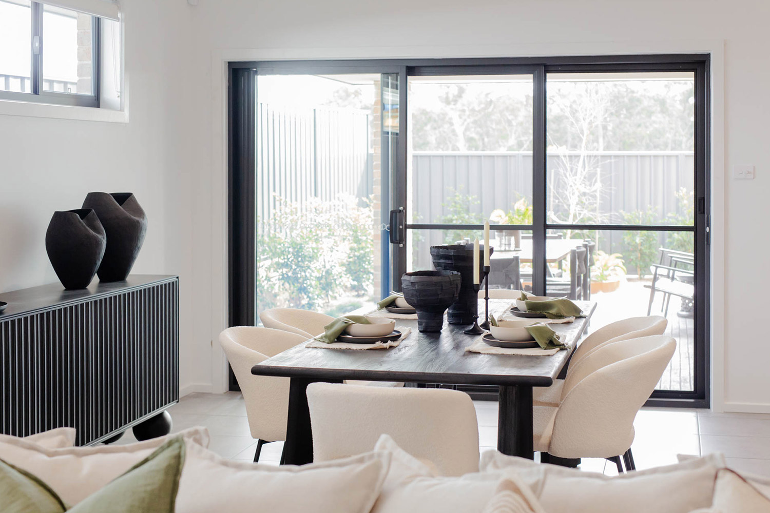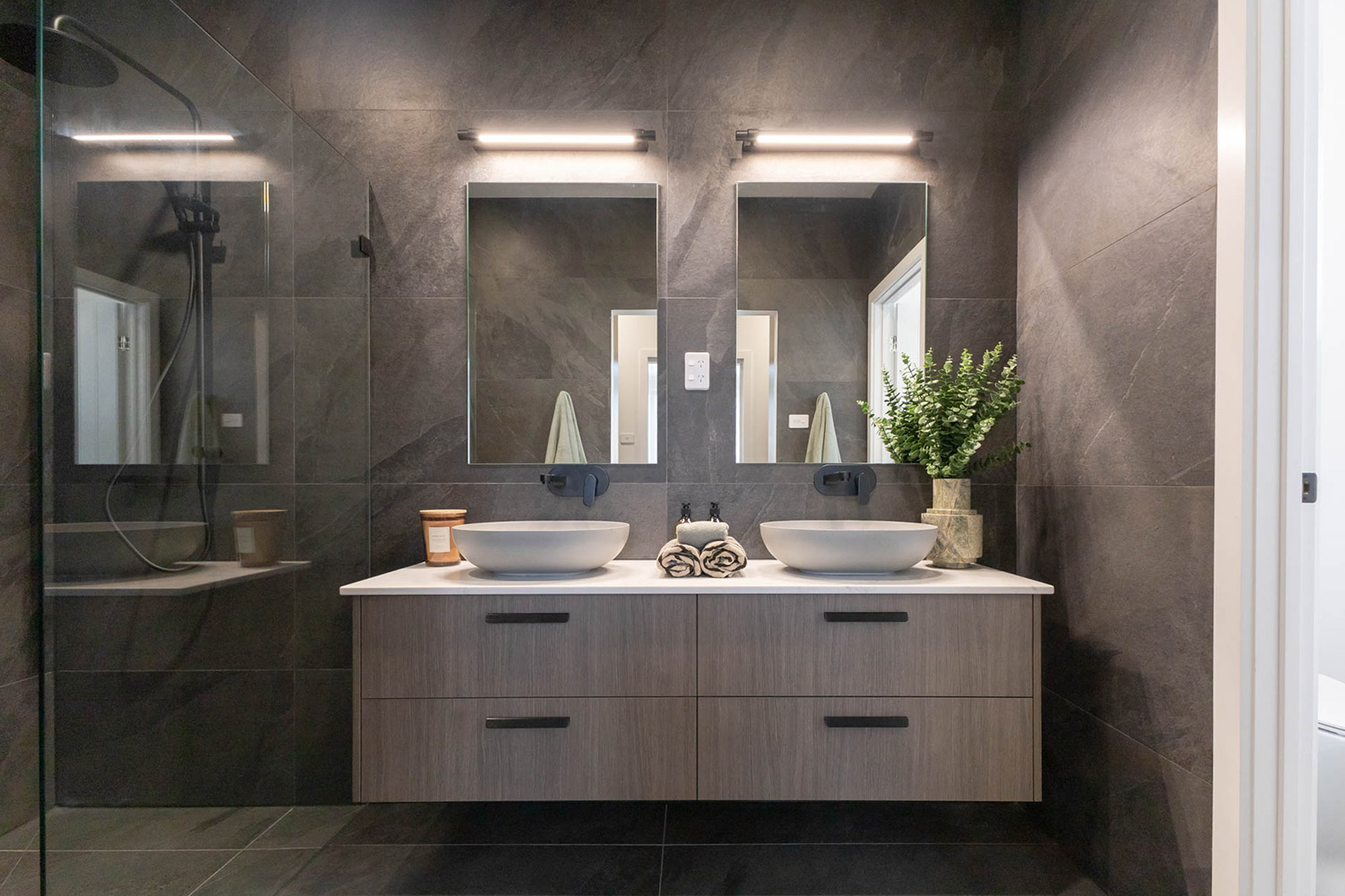 The modern industrial aesthetic is defined by its high raked ceilings, concrete-look tiles, dark timber tones, and matte black finishes.