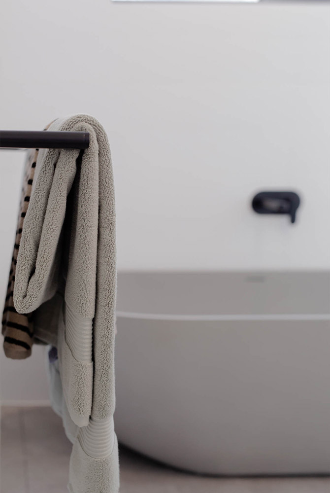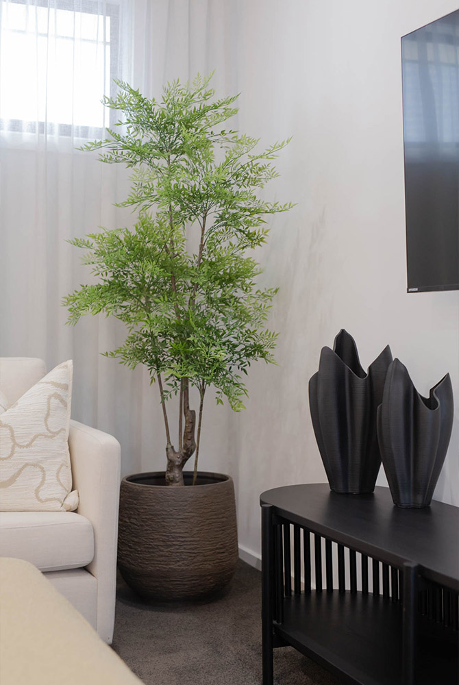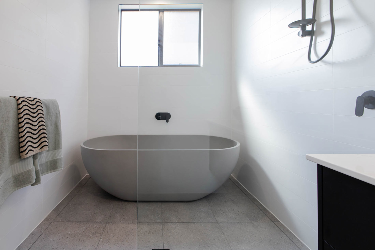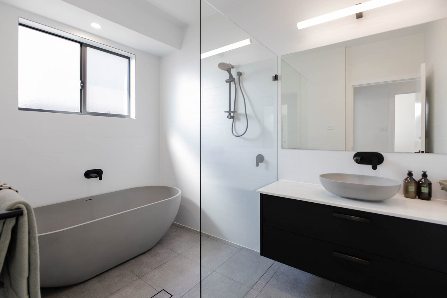 The modern industrial aesthetic is defined by its high raked ceilings, concrete-look tiles, dark timber tones, and matte black finishes.