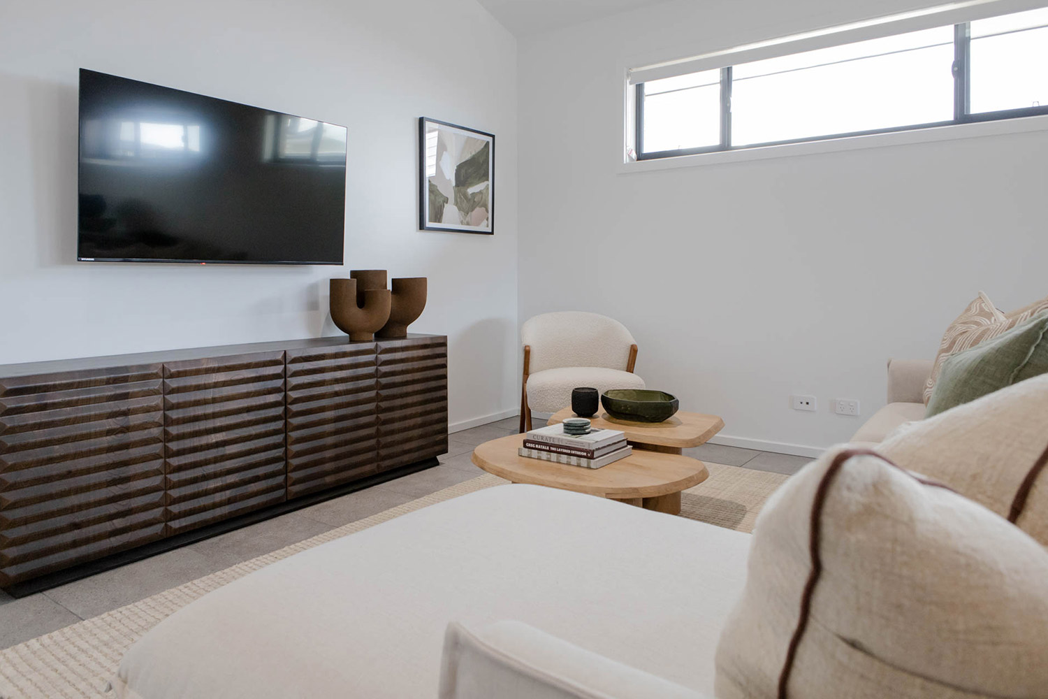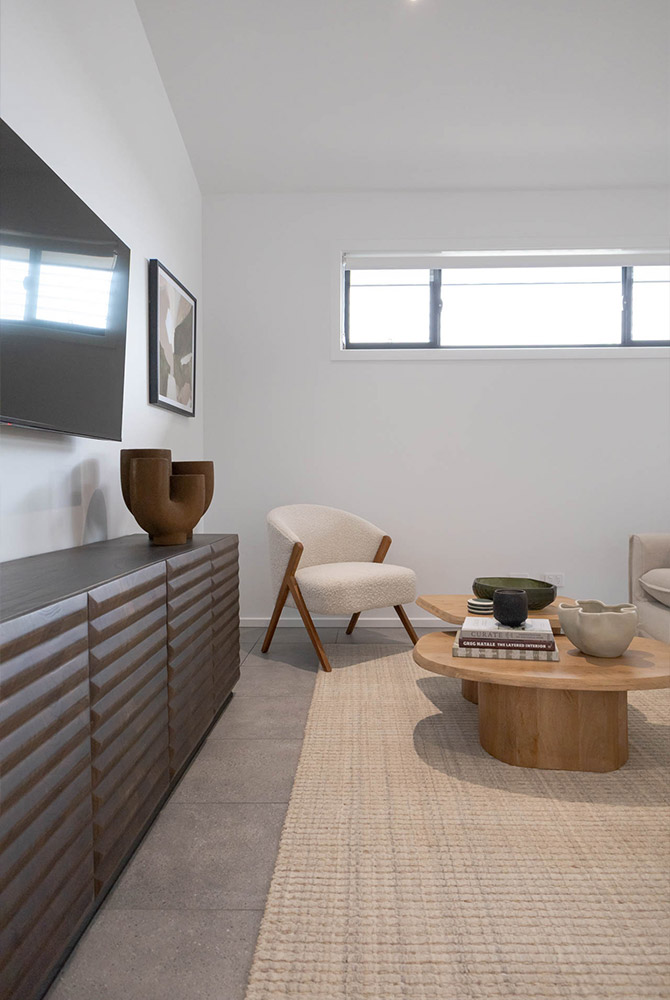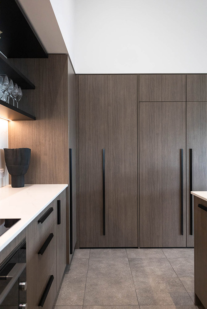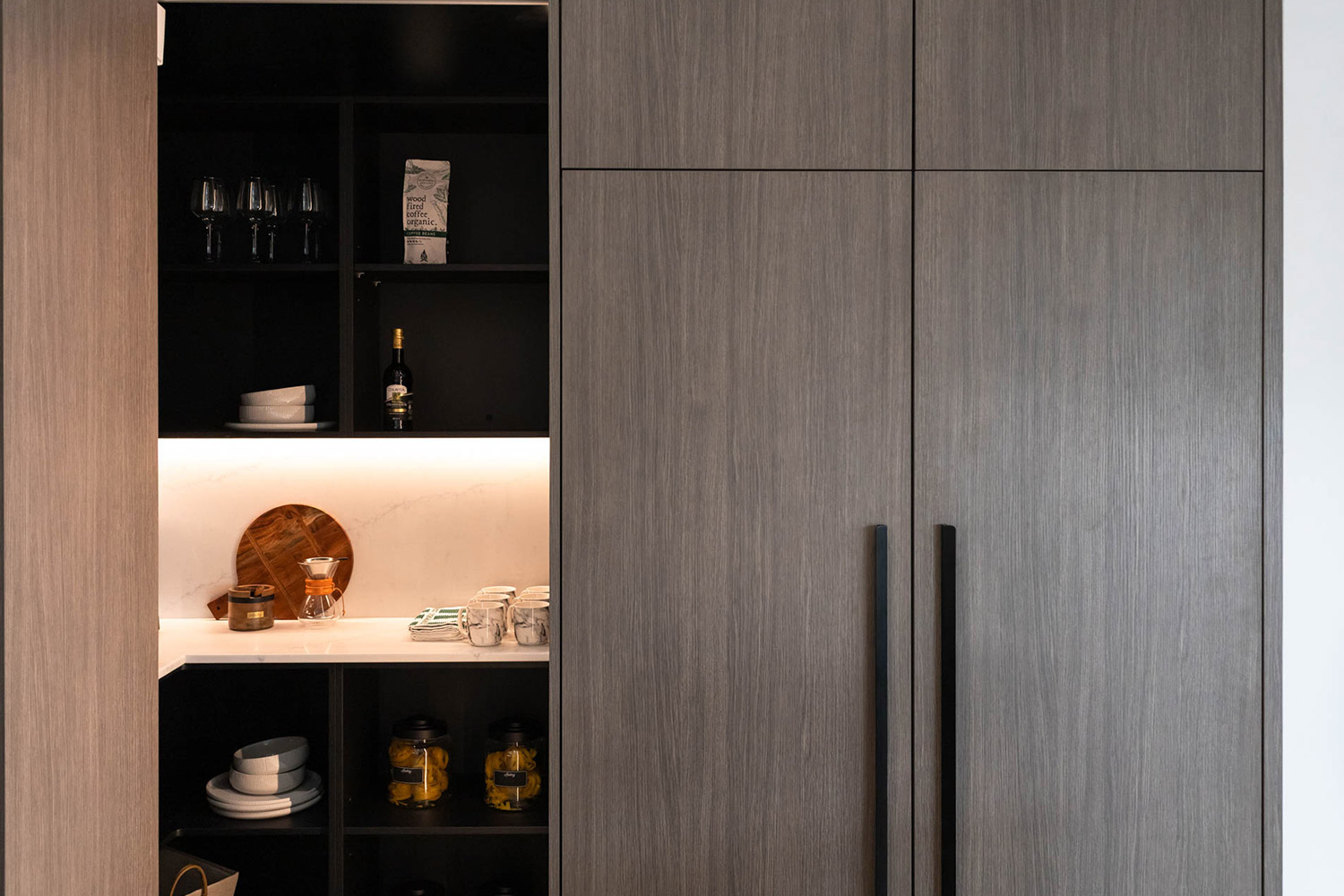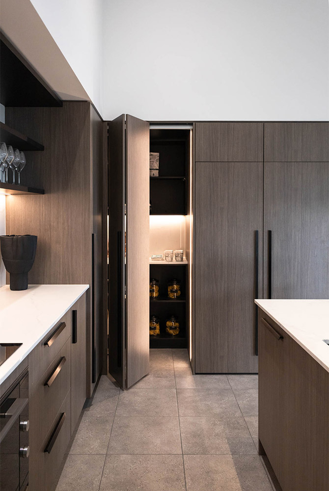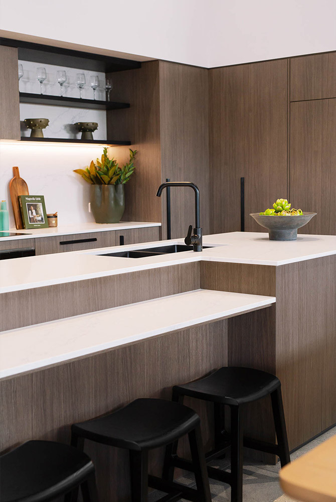 The kitchen is a stand-out future thanks to its tiered breakfast bar, hidden pantry and wood-grain cabinetry.