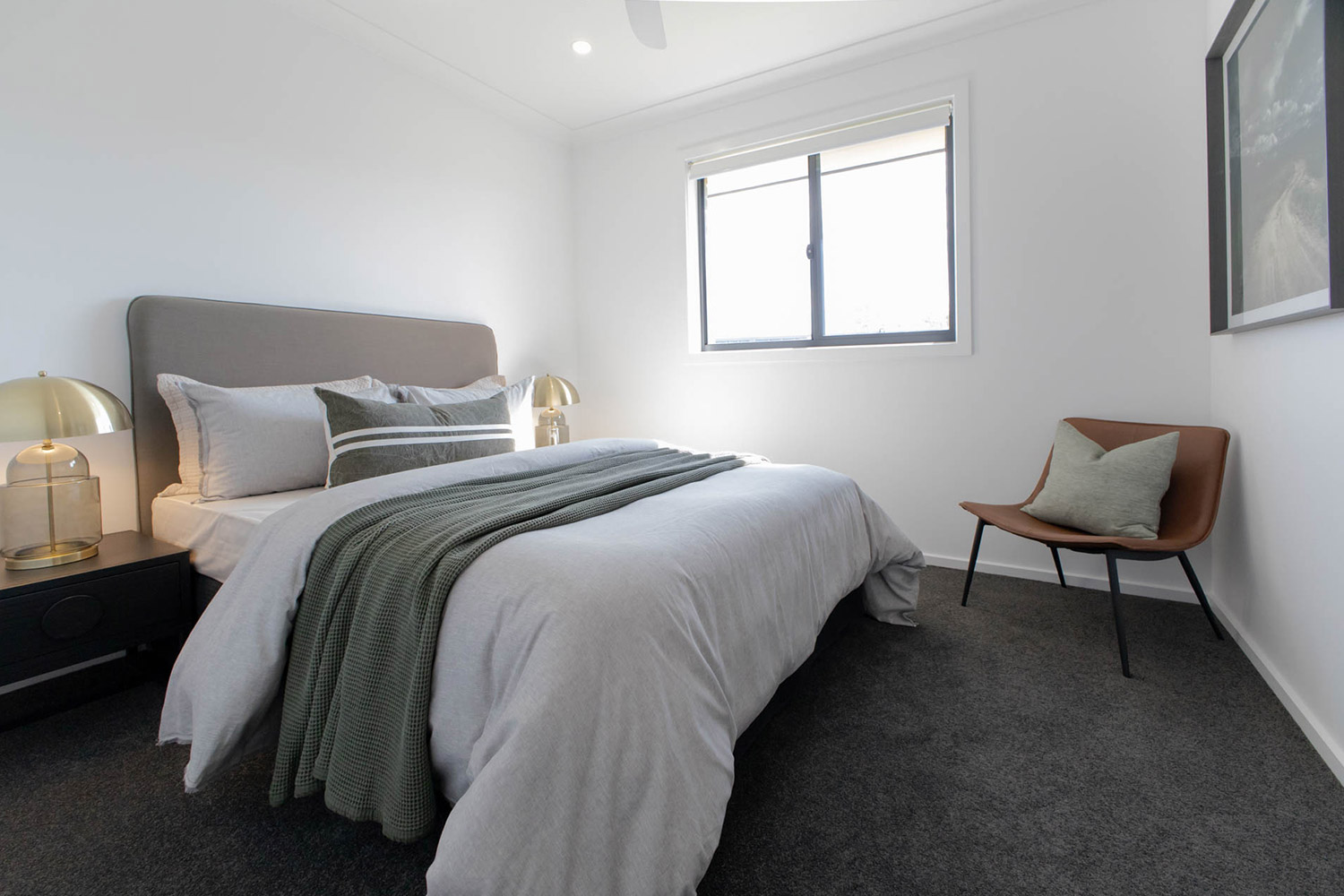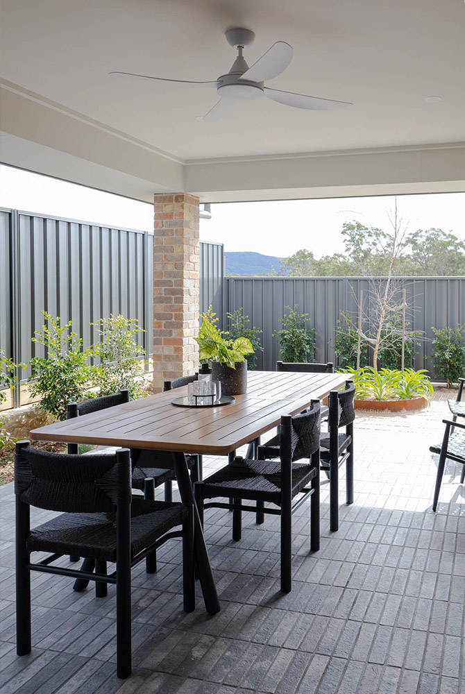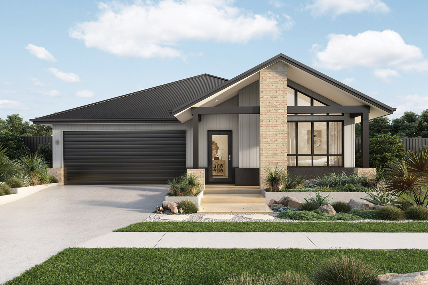 The Sterling 262 is a modern Australian single-storey home, with a contemporary façade of soft grey cladding, rich brick tones and charcoal accents.