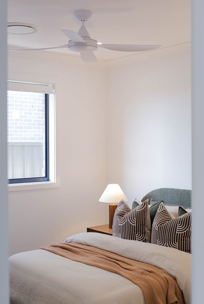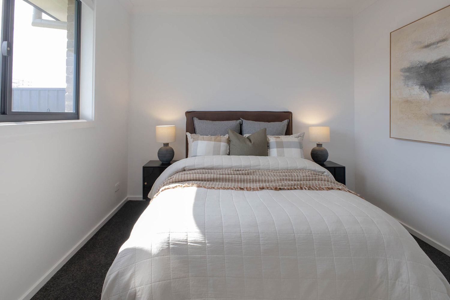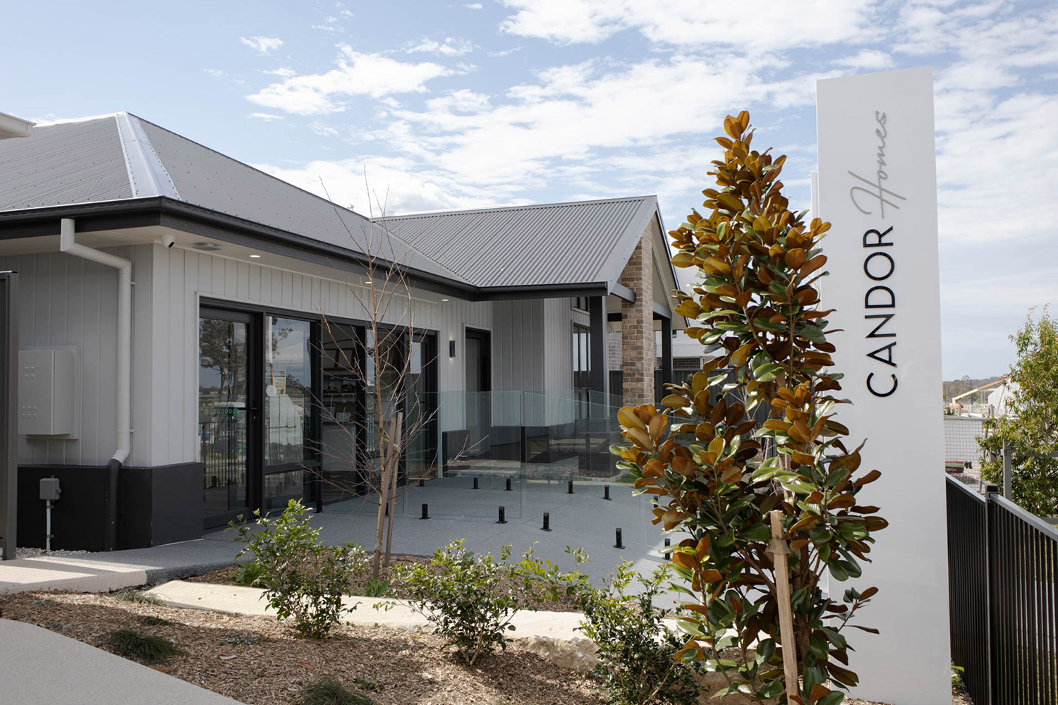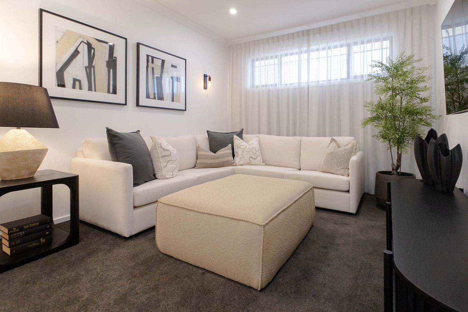 The Sterling 262 is a modern Australian single-storey home, with a contemporary façade of soft grey cladding, rich brick tones and charcoal accents.