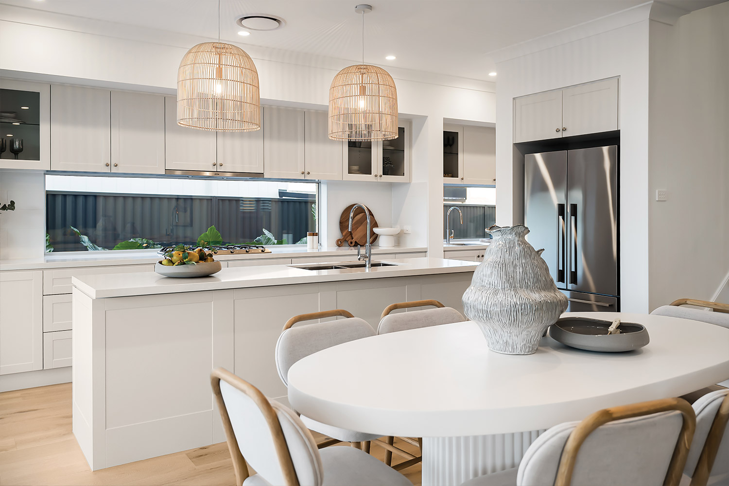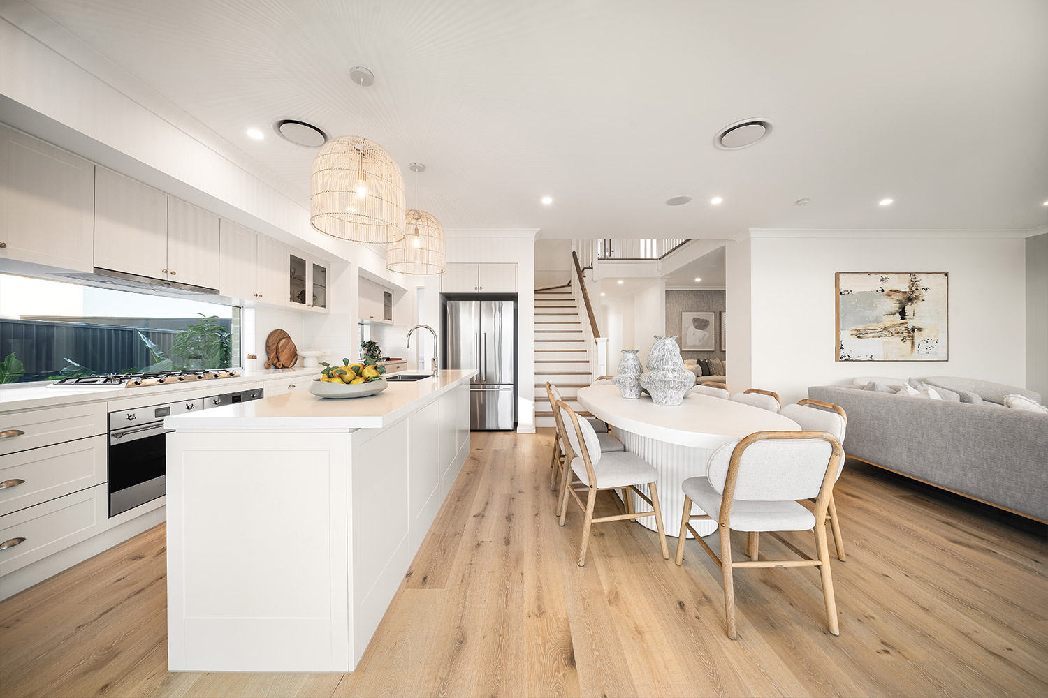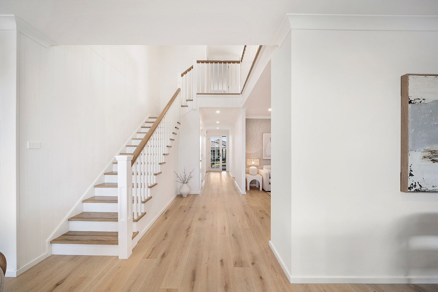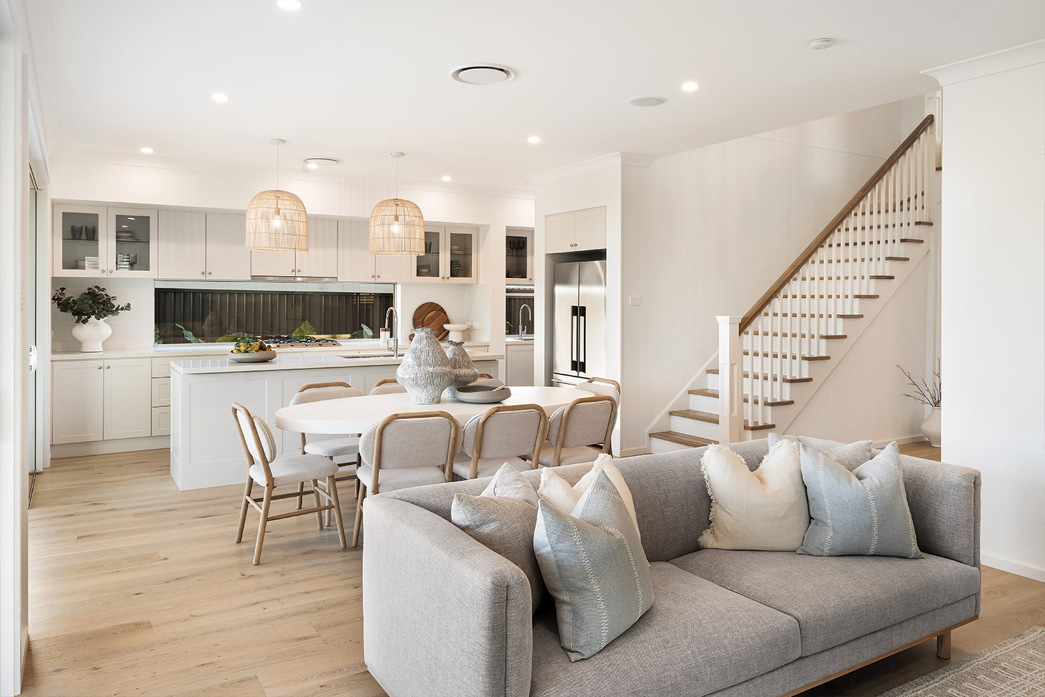 Cross the covered tiled porch topped by a central balcony and step inside, and you're greeted by the warmth of wide-plank oak timber flooring bathed in natural light. The light timber combines with soft whites, warm greys and textured materials such as linen, sisal and rattan to create an interior décor that feels instantly inviting. Throughout the home, full height VJ wall panelling echoes the exterior detail and anchors the coastal aesthetic.