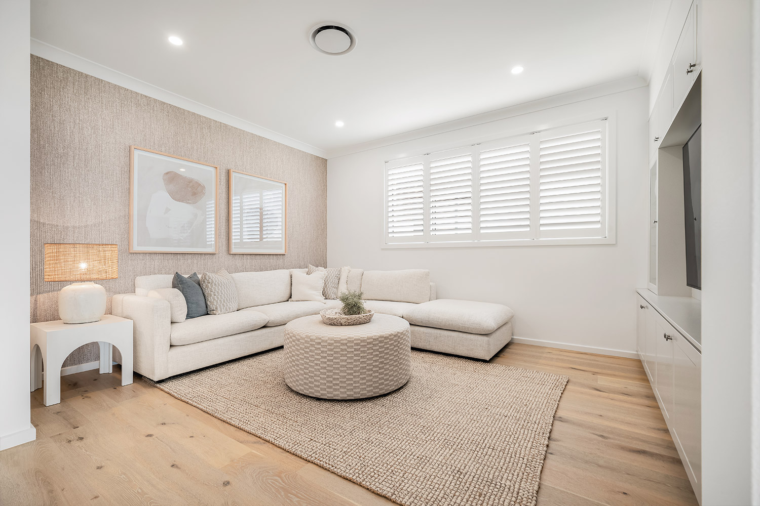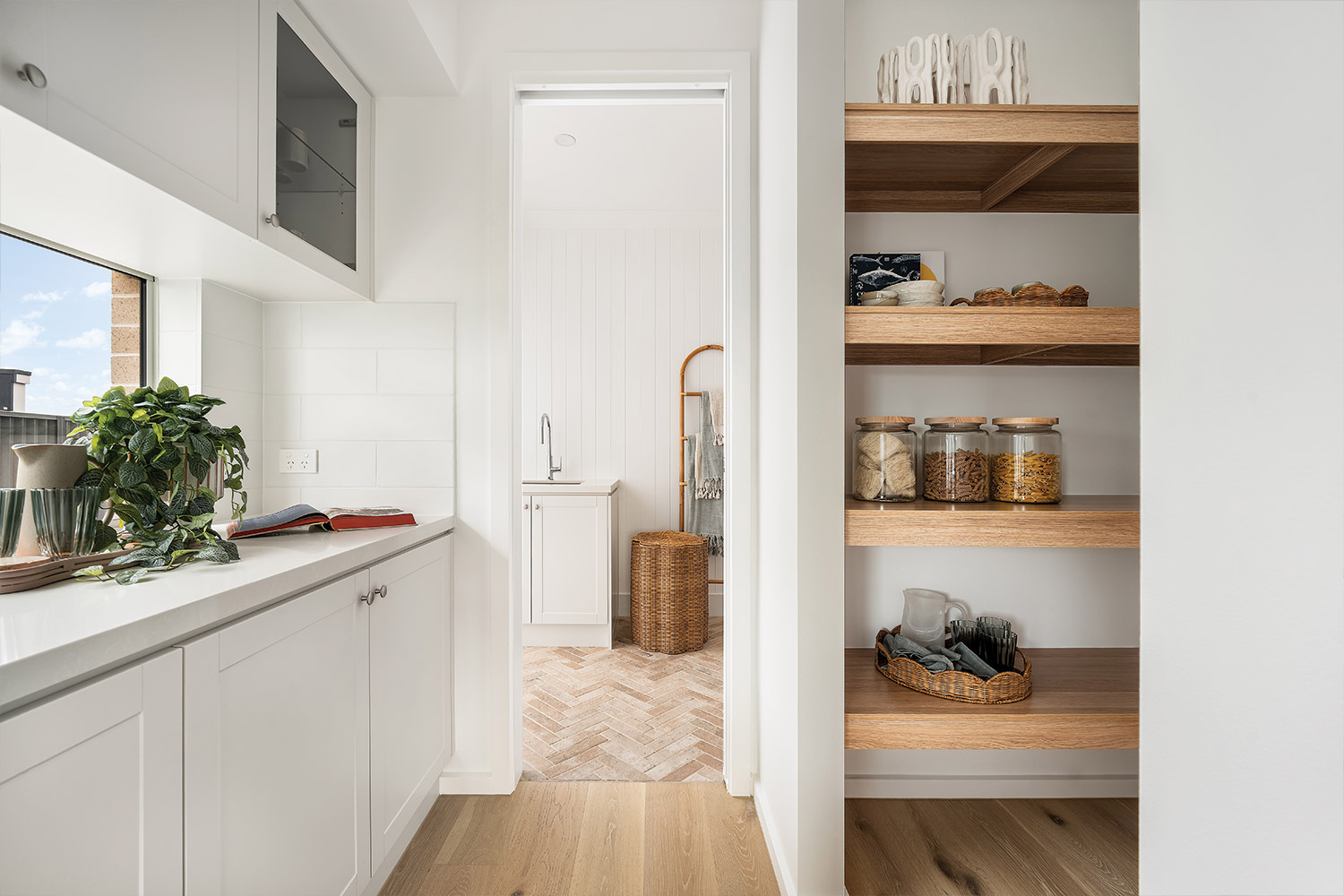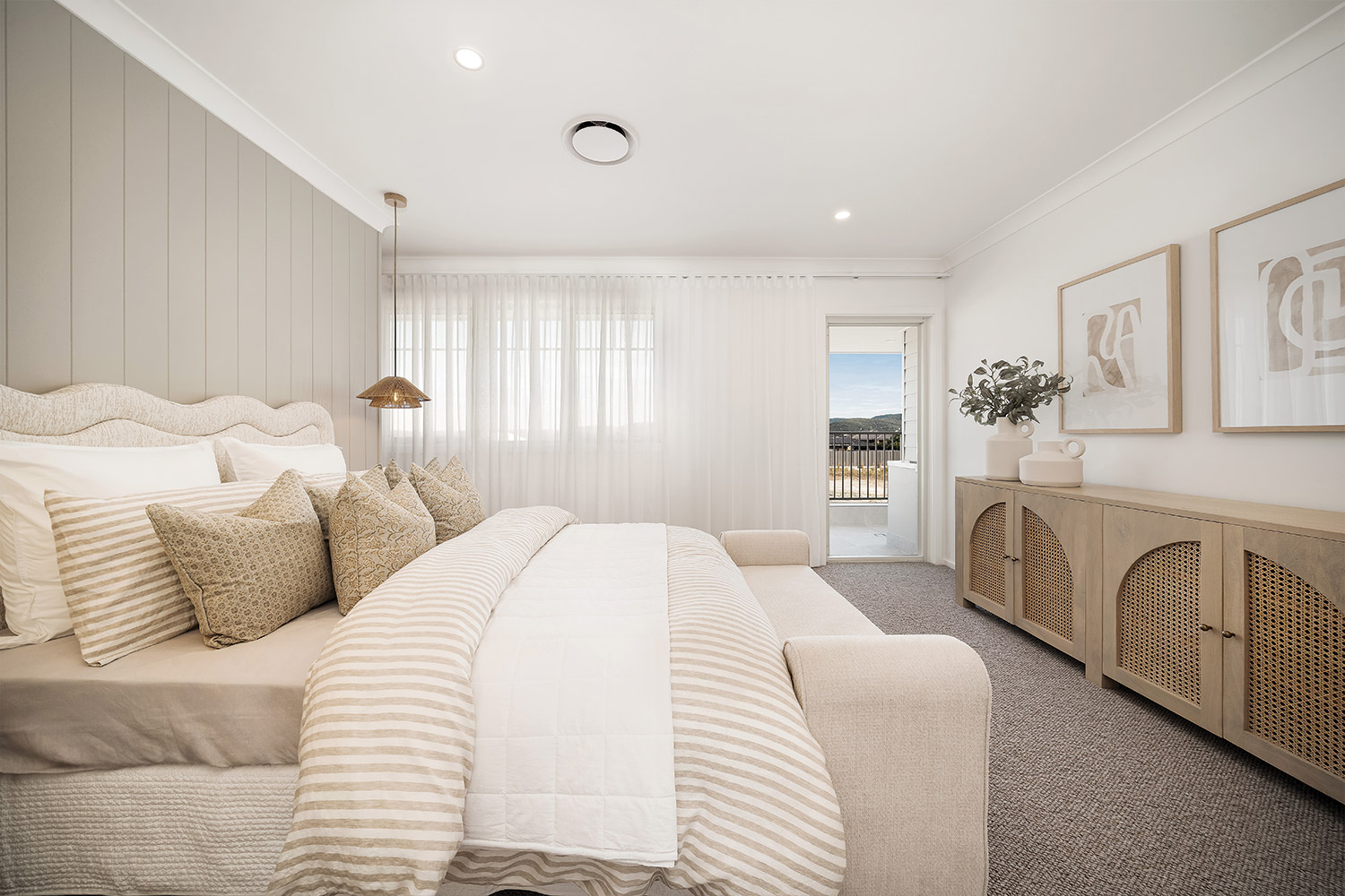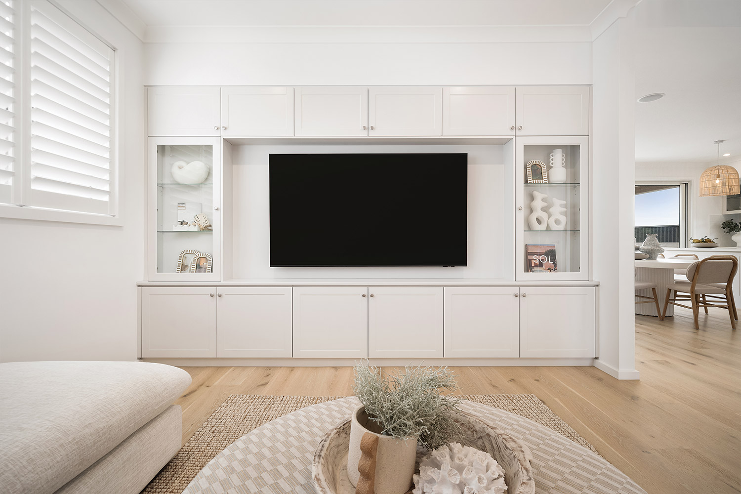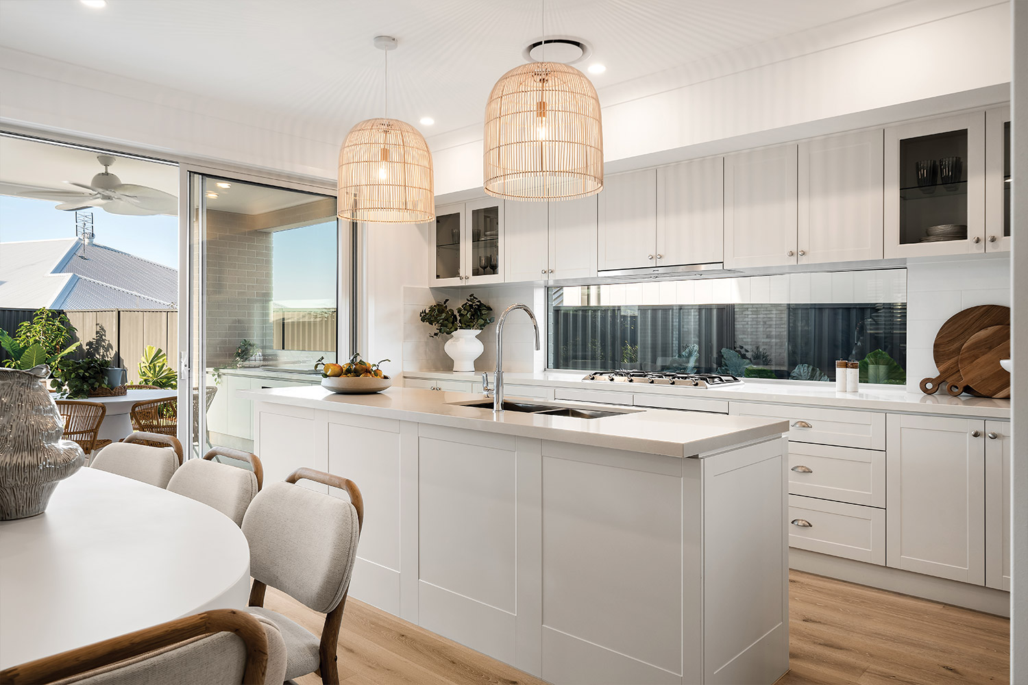 Cross the covered tiled porch topped by a central balcony and step inside, and you're greeted by the warmth of wide-plank oak timber flooring bathed in natural light. The light timber combines with soft whites, warm greys and textured materials such as linen, sisal and rattan to create an interior décor that feels instantly inviting. Throughout the home, full height VJ wall panelling echoes the exterior detail and anchors the coastal aesthetic.