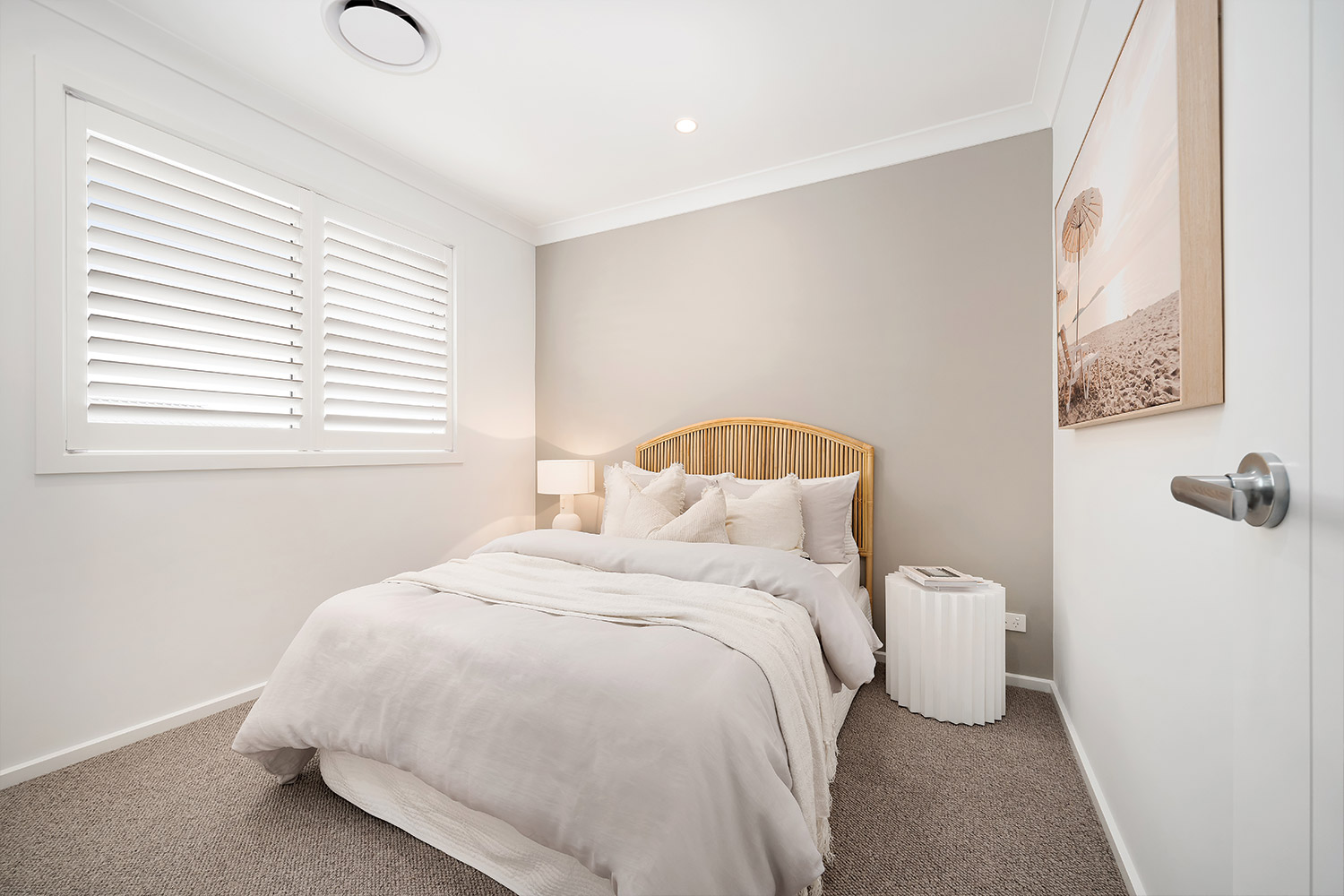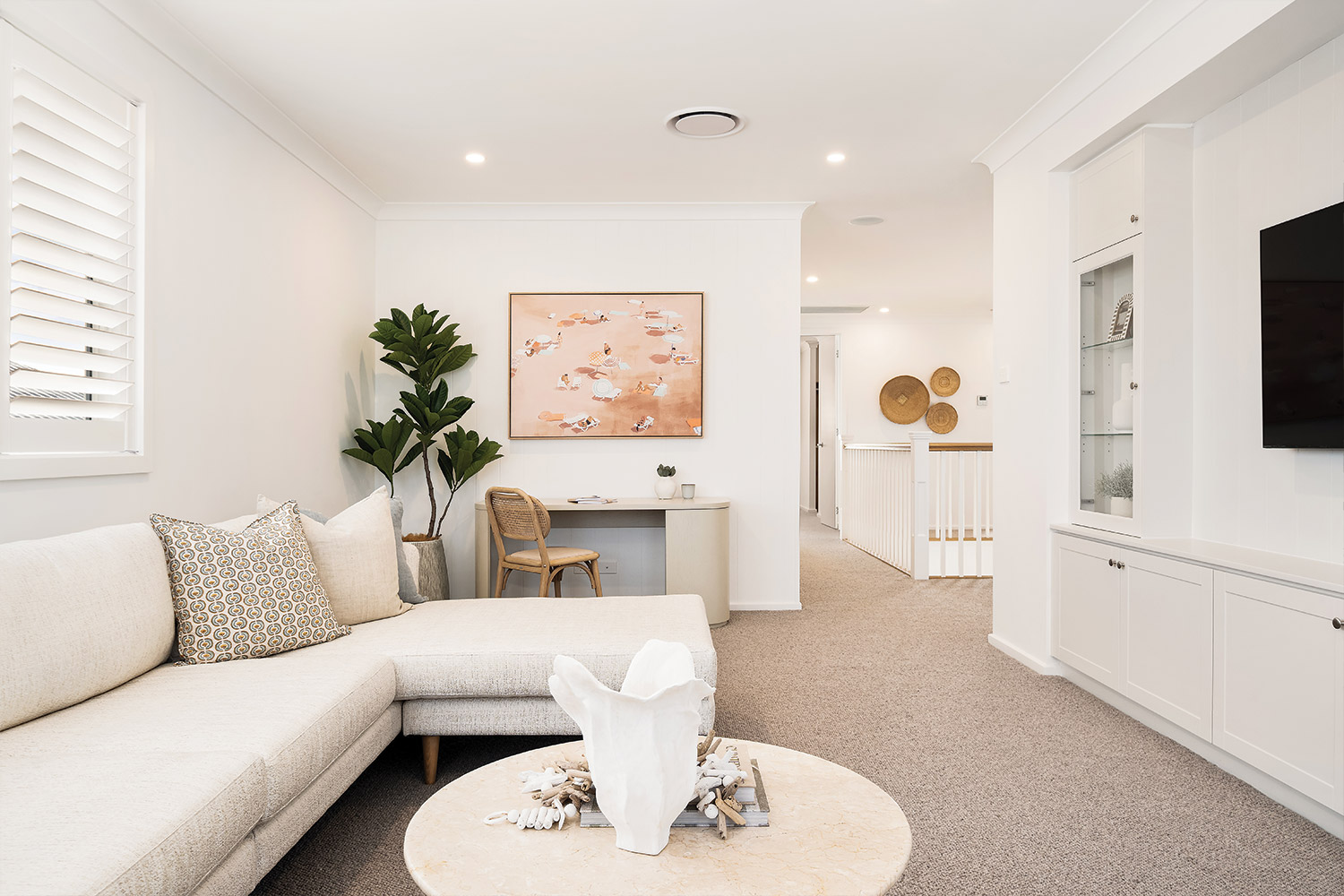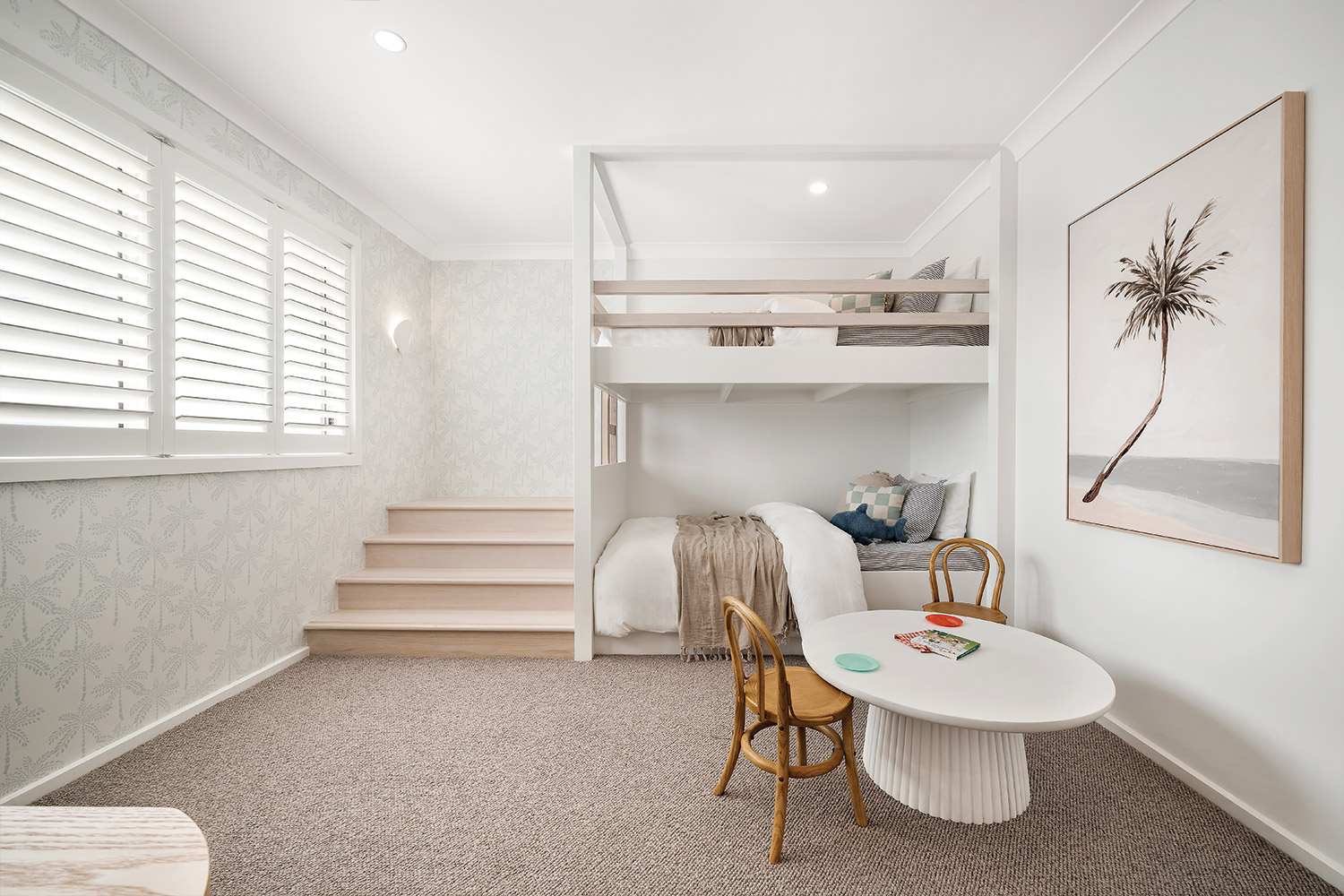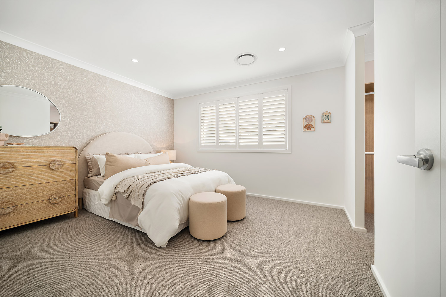 Ascend the staircase under the expansive void, a striking feature that enhances the sense of openness and connection throughout the home. The carpeted upper floor is cleverly laid out, with a master suite positioned for privacy from the three upstairs bedrooms. This luxurious parents’ retreat features a walk-through robe and ensuite with dual basins and a full-sized bath. The addition of VJ wall panelling adds texture and warmth, echoing the refined finishes found throughout the home.