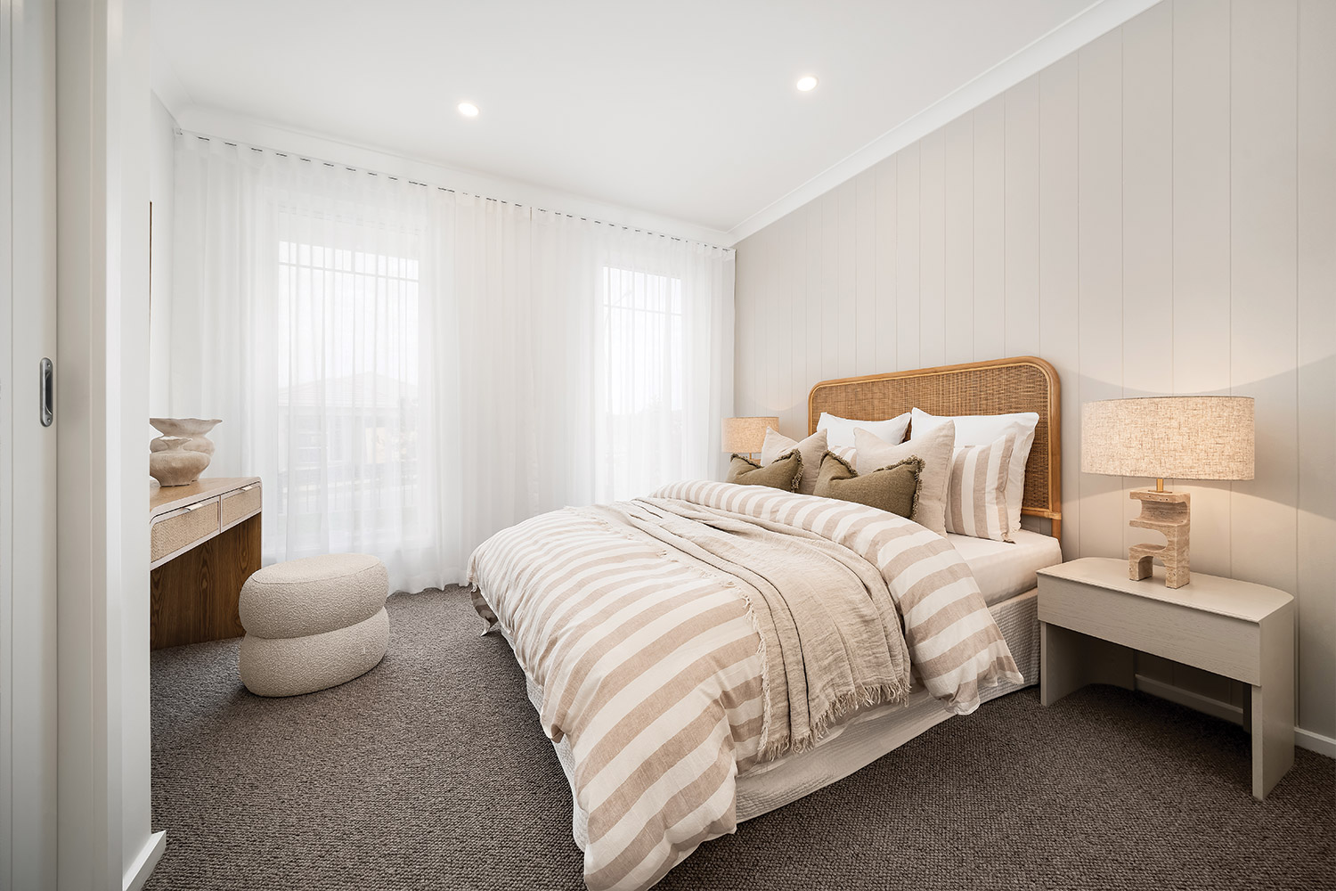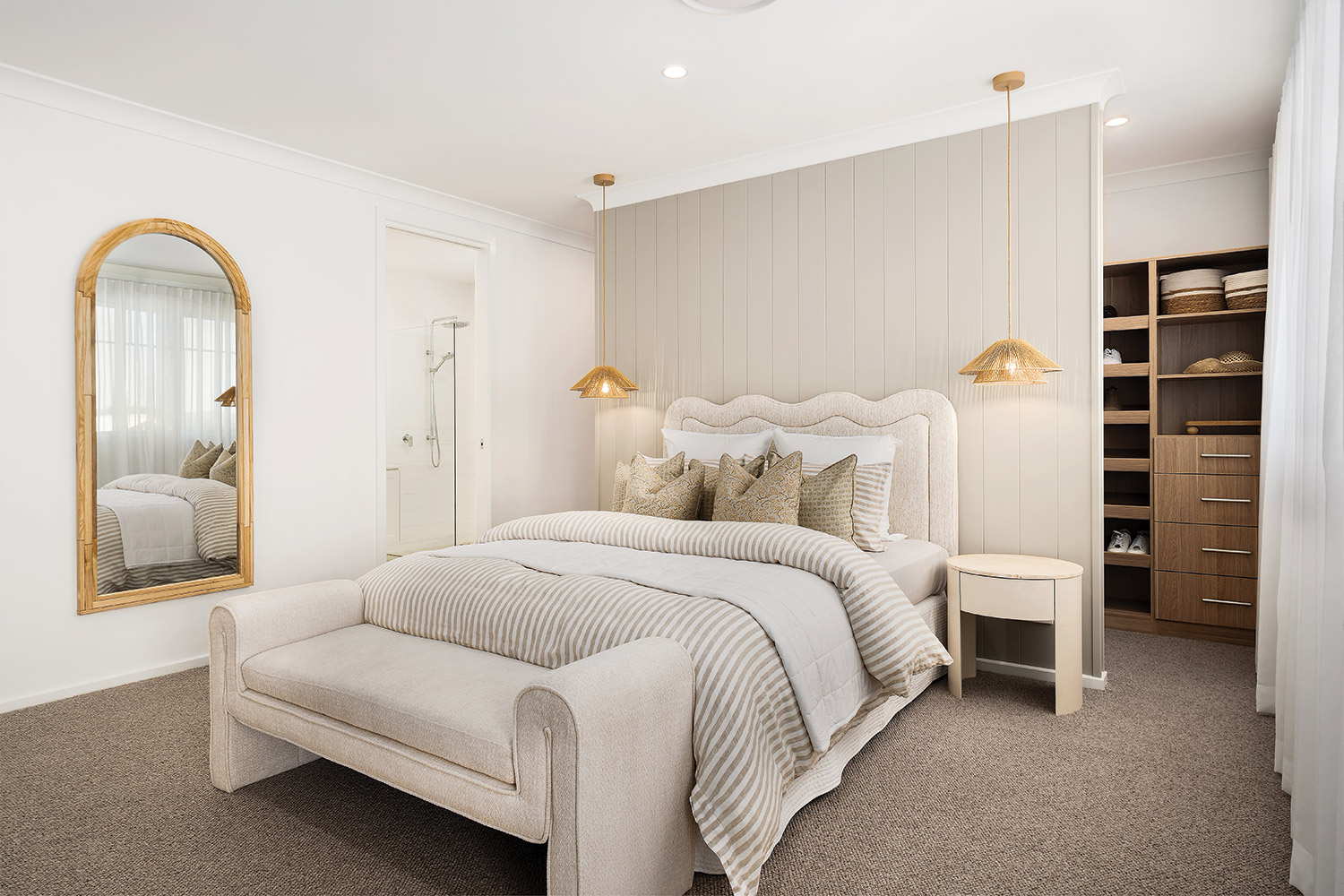 The Southampton façade makes an immediate impression, with a soft and classic aesthetic that channels an exclusive weekend retreat. The minimal palette of neutral hues – stone, white and cream - allows the expertly chosen materials to shine, highlighting textural finishes including feature stonework and vertical joinery to the upper floor. Large, deep windows amplify the classic charm, creating an instant connection between the inviting interiors and its picturesque surroundings.