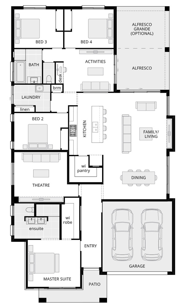 The Havana range seamlessly combines all the practicalities you desire so you can enjoy everything you love about being home – every day. Each design in the Havana range caters to different locations and lifestyles through modern architectural design creating liveability and adding a little luxury to your home. Built-in desks, additional storage, and children’s activity or home theatre or both – so you can create a unique living experience that suits your needs. Family is number one in Havana – and there’s plenty of scope for multi-functional use of space. A well-appointed gourmet kitchen overlooks the spacious dining and living zones, which flow generously to the airy alfresco. Depending on your design, there’s also a generous theatre or activities to ensure plenty of social spaces and quiet relaxation areas.