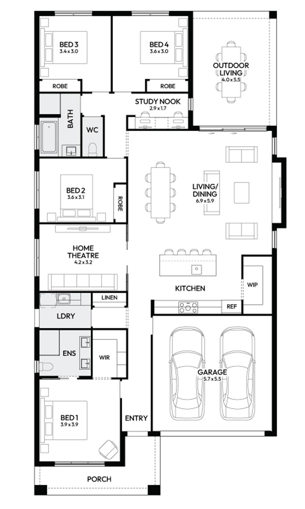 The Essence 26 offers the perfect blend of space and comfort for modern family living. With four spacious bedrooms, an open-plan kitchen with a walk-in pantry, and a dedicated home theatre, it’s ideal for those seeking both style and functionality. Plus, the outdoor living area ensures seamless indoor-outdoor flow, perfect for entertaining or relaxing. Complete with double garage, the Essence 26 is rich in charm and offers contemporary family lifestyle.