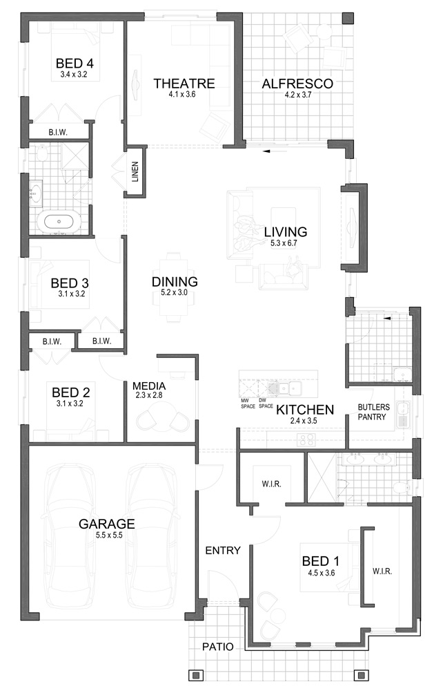 Additional living zones add flexibility for growing families, including a dedicated home theatre for movie nights and an extra media room that’s perfect as a home office, study space for the kids or quiet retreat. An included alfresco extends the living outdoors, providing the ideal setting for relaxed weekend barbecues and year-round entertaining.